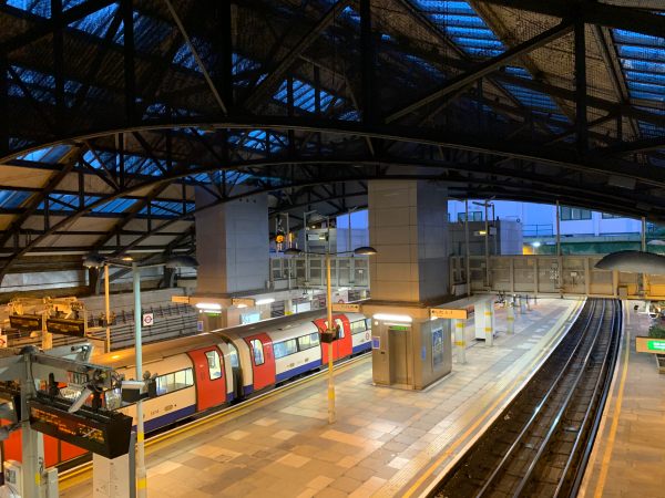 The platform has a sharp curve, negotiated with squealing wheels, where the line turns 90 degrees towards Morden.