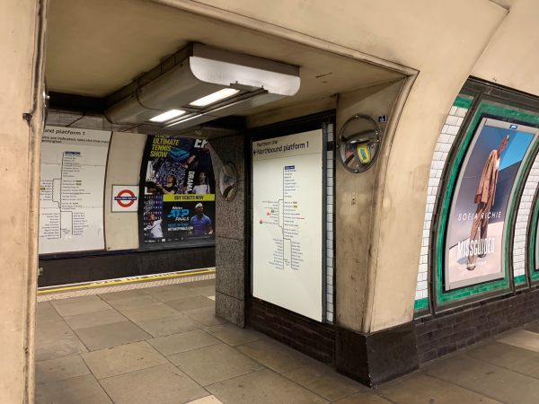 Glass screen, roundel, stone pillars, tiling, handrail, skylight out of picture. Over 14 million people access this station annually. A station that hasn’t changed that much visually for nearly 100 years. It is a living museum.
